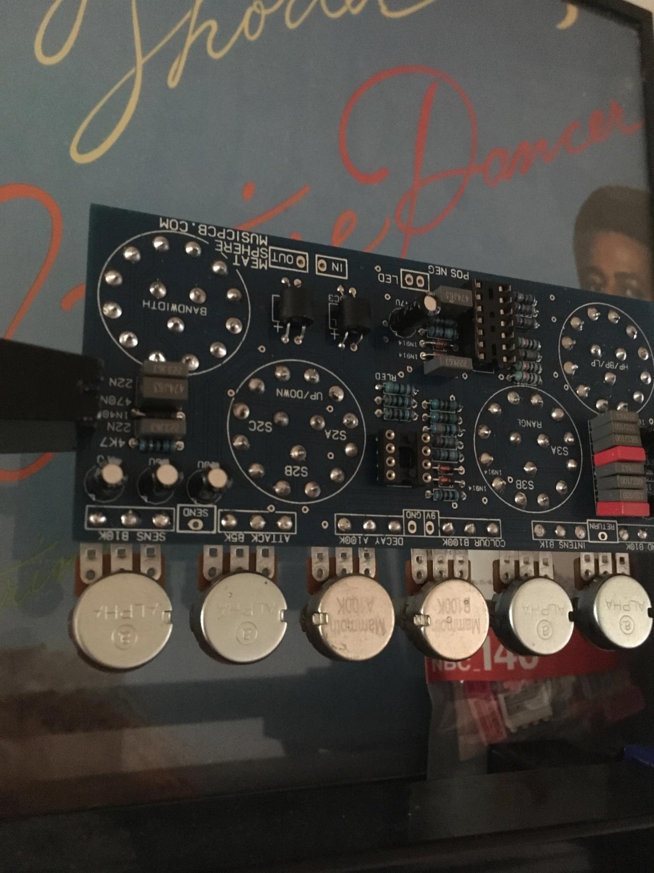 Populated PCB (and Wayne Shorters Native Dancer EP in the background for good luck). Mounting all the pots directly on the PCB saved a ton of time and eliminated many of the potential problems that come from wiring them up offboard.
